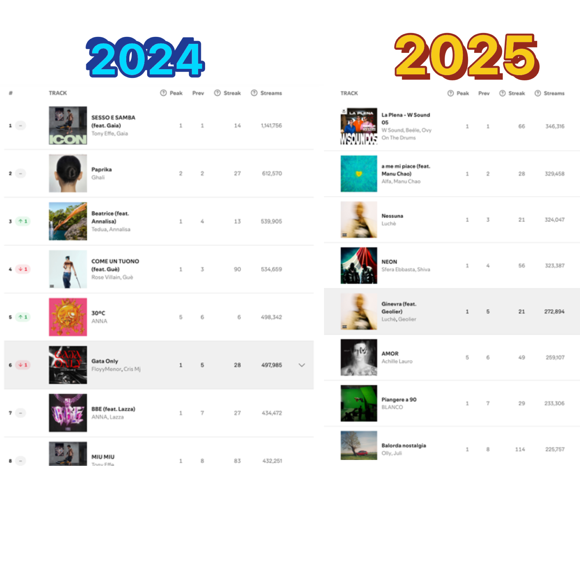 A livello globale concordo, però a livello italiano (che soprattutto in estate è un mercato campanilista) è successo qualcosa. Più o meno i nomi son li stessi, Olly, Effe, Annalisa, Rose V, Ghali.. ci sarebbe da capire qualche fattore sia cambiato.