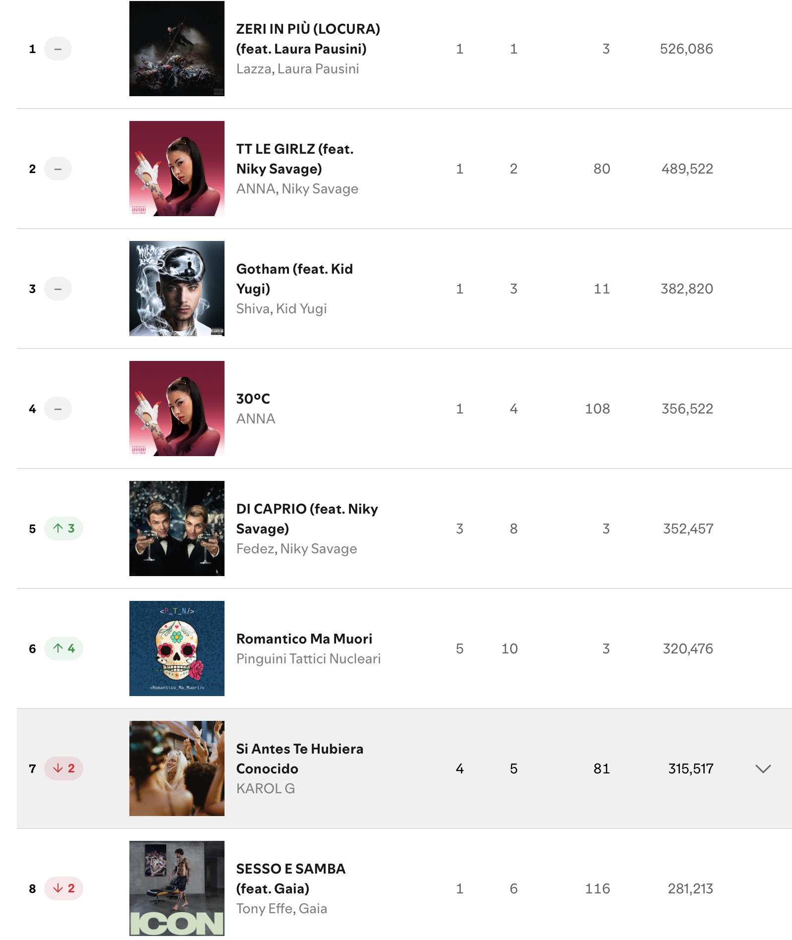 Per dire che un anno fa Per due come noi con 17 giorni di vita di domenica faceva 262k streams. Con lo stesso numero di giorni Annalisa-Mengoni ne hanno fatti 104k e Irama-Elodie 105k.