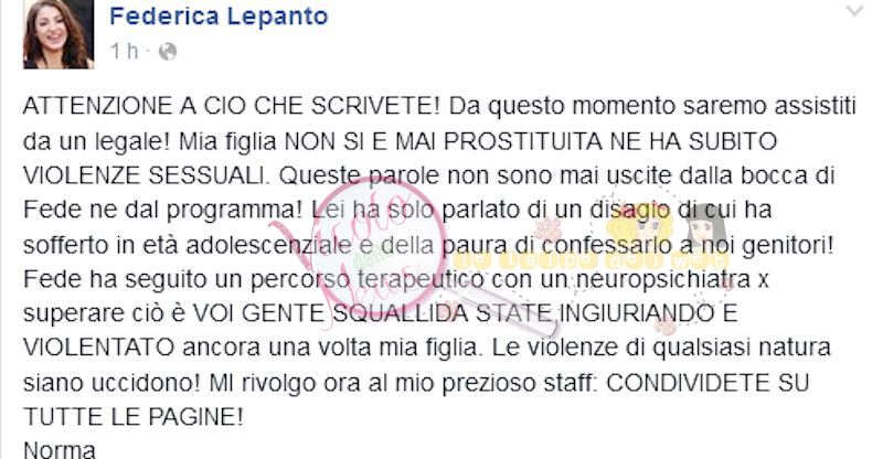 Tralasciando il pessimo italiano della madre, su facebook ha scritto frasi come " fatti dolorosi ma meno gravi di quanto possano essere sembrati, quando sarà fuori Fede potrà spiegare a voi il significato delle parole dette in confessionale".