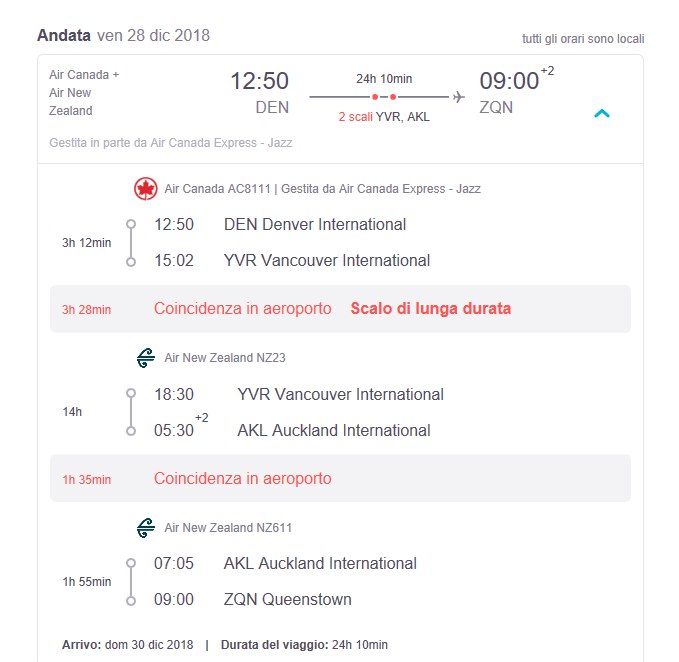 Location di arrivo: Aeroporto di Queenstown alle 21.00 italiane del 29 dicembre