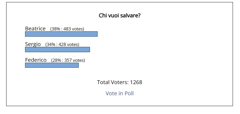 OfflinePenso che alla fine uno tra Sergio e Stefano sarà eliminato,finendo sempre al televoto con Beatrice saranno molto penalizzati,ai fans della fazione opposta basterà votare l'altro che andrà in nomination,già nella scorsa nomination Sergio aveva solo poco più di un punto di vantaggio su Rosanna.