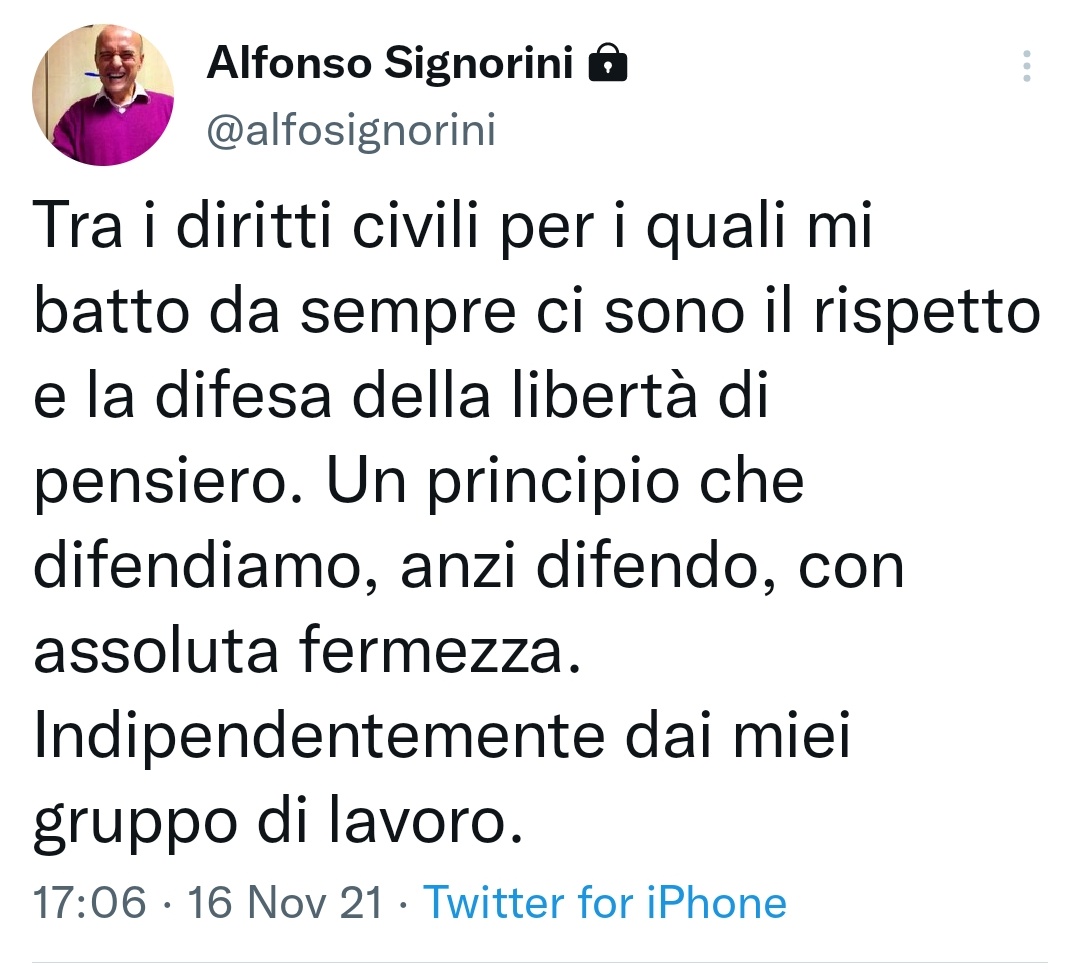 “Tra i diritti civili per i quali mi batto da sempre ci sono il rispetto e la difesa della libertà di pensiero. Un principio che difendiamo, anzi difendo, con assoluta fermezza. Indipendentemente dai miei gruppi di lavoro“