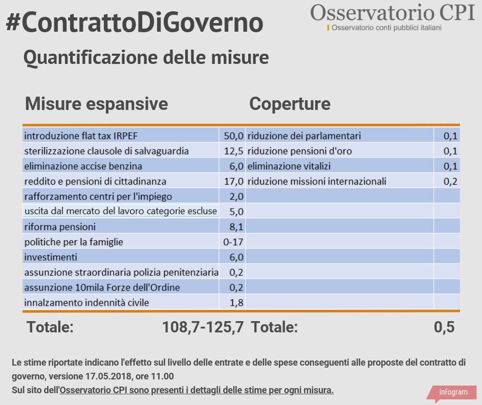 Comunque avranno un gran da fare per far quadrare i conti. L’Osservatorio sui Conti Pubblici Italiani ha messo a disposizione una quantificazione delle misure incluse nel Contratto di Governo proposte da Lega e Movimento 5 Stelle.