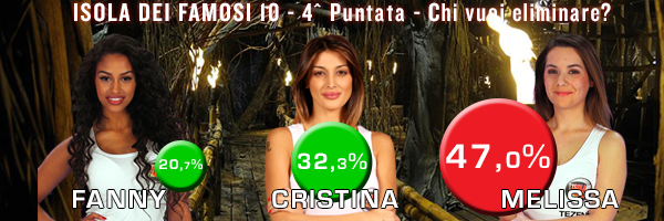 Offlinestasera prevedo due eliminazioni, melissa o cristina al televoto e fanny ritirata...perchè voglia di stare in quell'isola non ne ha...e lo ha ribadito 100 volte...