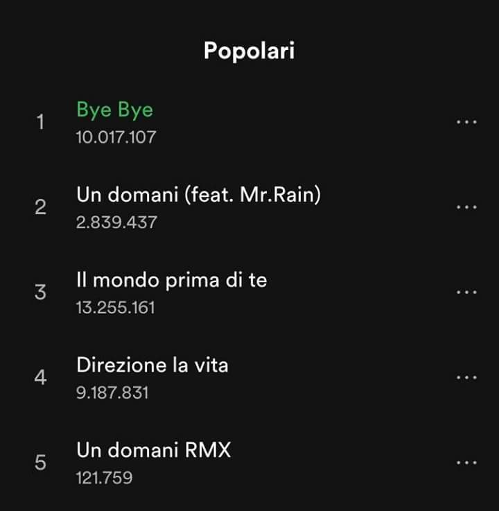 Vorrei far notare come il Rmx di Un domani sia entrato tra le popolari di Annalisa, scavalcando la finestra. Cosa che non è successa al remix di Bye Bye che anzi si è fermato a numeri inferiori di riproduzioni.Un domani rmx ha già superato i 120.000 streams e se continua così aiuterà molto la canzone.