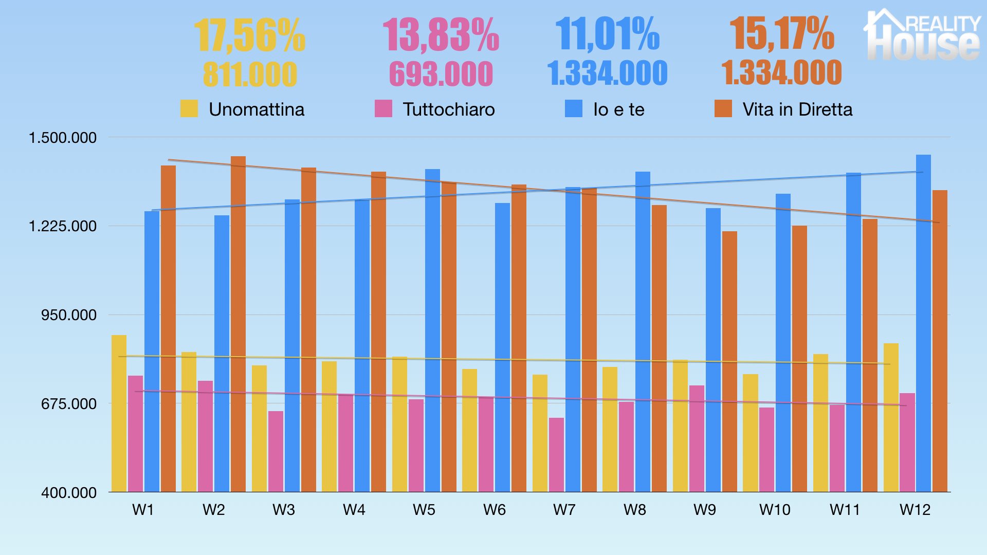 RAI1 Vieni da Me – 1594 12.47 La vita in diretta - 11.50 + 1274 12.70 CANALE5 Una Vita – 2190 15.94 Bitter Sweet – 2245 19.35 Il Segreto – 1830 18.27 Pomeriggio 5 - 1343 14.05 + 1558 15.06