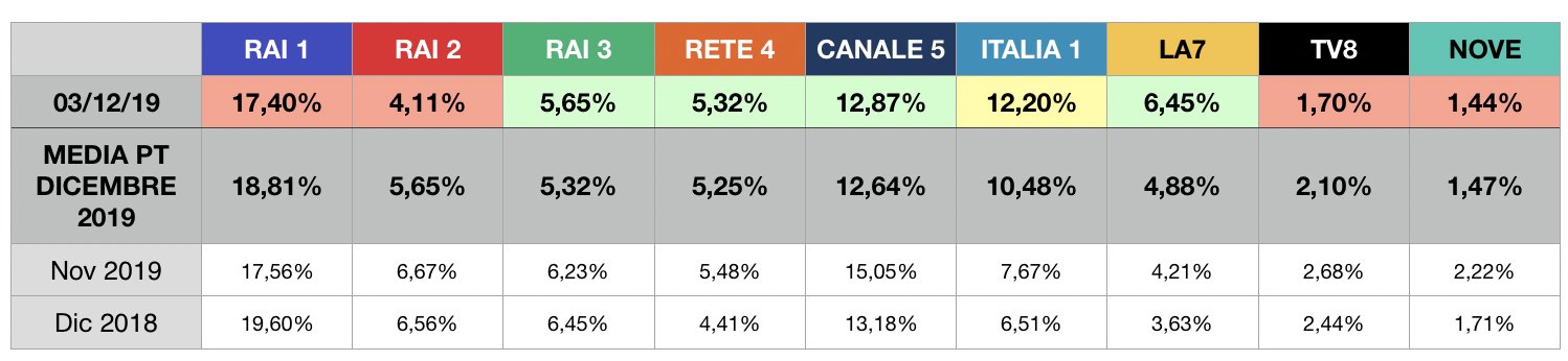 Classifica confermata a Novembre, con Rai 1 in calo (unica rete a scendere sia mom che yoy), ma ancora davanti a Canale 5 abbastanza agevolmente. Italia 1, Rai 2, Rete 4 e TV8 crescono significativamente rispetto all'anno scorso, mentre NOVE è l'unico canale che accende due luci verdi su entrambi i dati precedenti, grazie al 2,22% di questo mese (ma ancora lontana dalla rete in chiaro di Sky).