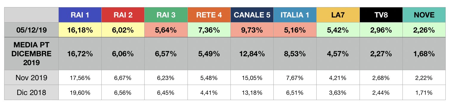 Nel computo totale delle nove reti risultati abbastanza stabili, con mediaset che prende mezzo punto e Rai che ne perde 1 e mezzo.