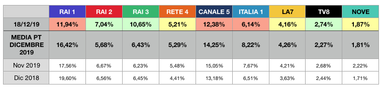 RAI1 Vieni da Me – 1727 12.70 Paradiso delle Signore – 1648 14.50 Zecchino d’Oro – 1868 14.82 CANALE5 Una Vita – 2402 16.63 Uomini e Donne – 2320 18.55 + 2142 18.90 Il Segreto – 2244 20.30 Pomeriggio 5 – 2156 17.76 + 2308 16.96