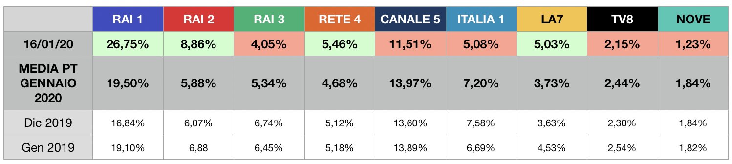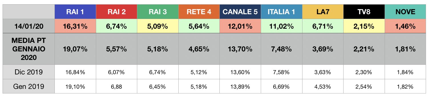 RAI1 Vieni da Me – 1932 14.05 Paradiso delle Signore – 1815 16.20 Vita in Diretta – 1401 12.67 + 1811 14.00 CANALE5 Una Vita – 2554 17.39 Uomini e Donne – 2497 19.49 + 2166 19.15 GF VIP - 2125 19.50 Amici - 2281 21.17 Il Segreto – 2236 20.21 Pomeriggio 5 - 2042 16.98 + 2499 17.74