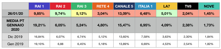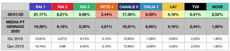 RAI1 Vieni da Me – 1893 13.30 Paradiso delle Signore – 1889 16.00 La Vita in Diretta – 1922 14.71 CANALE5 Una Vita – 2455 16.46 Uomini e Donne – 3032 22.74 + 2435 20.63 GF Vip – 2142 18.65 Amici – 2150 18.99 Il Segreto – 2237 19.20 Pomeriggio 5 – 2020 16.68 + 2308 16.44