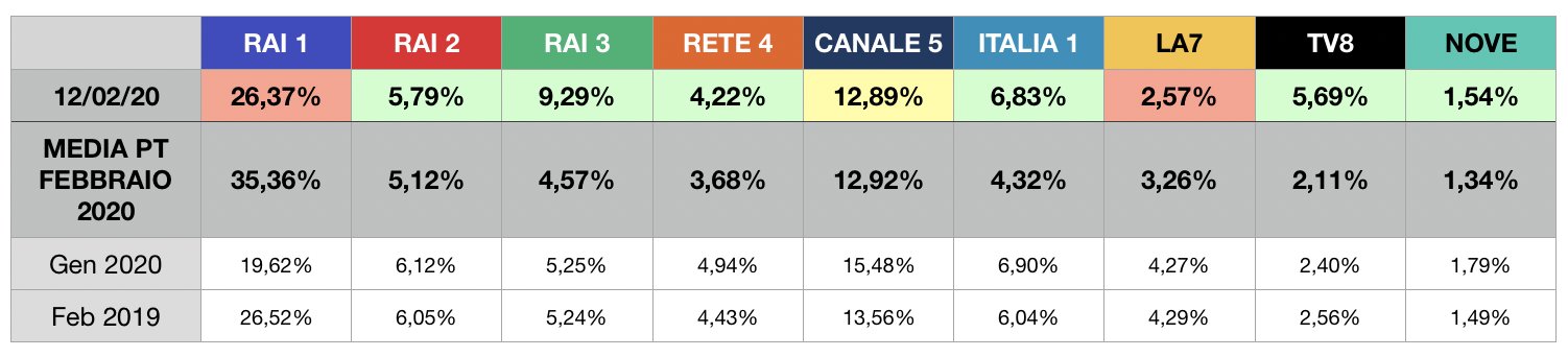 RAI1 Linea Bianca – 1912 11.90 Passaggio a Nord Ovest – 1181 8.51 A Sua Immagine – 1005 7.98 + 1014 8.20 Italia Sì – 1619 12.89 + 2028 14.02 CANALE5 Amici – 3205 21.92 Verissimo – 2590 20.87 + 2625 19.46