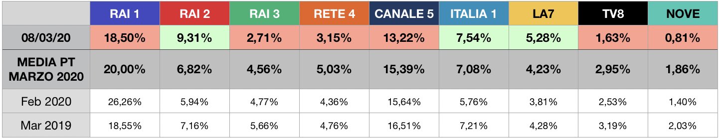 RAI1 Uno Mattina - 1365 20.13 Storie Italiane - 1587 18.06 + 1797 17.98 Prova del cuoco - 1924 12.07 CANALE5 Mattino 5 - 1344 15.48 + 1499 17.12 Forum - 1898 15.29