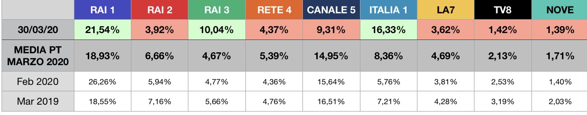 OfflineA me pare palese che la sera la gente voglia un minimo di distrazione, ma loro si ostinano a mettere una finestra sul coronavirus in prima serata sulle reti principali. Hanno tutta la giornata per fare approfondimento e comunque in prima serata possono usare le reti minori, come Rete 4 e Rai 3. La gente dopo una giornata in casa tra mille preoccupazioni e ansia, quando si mette sul divano la sera vuole staccare la spina.
