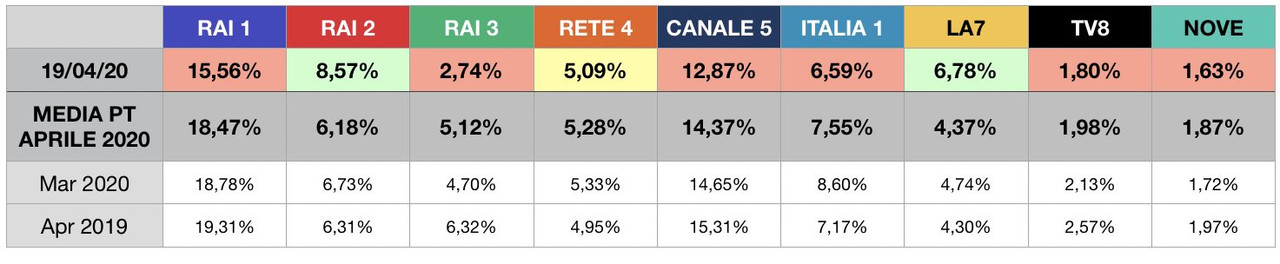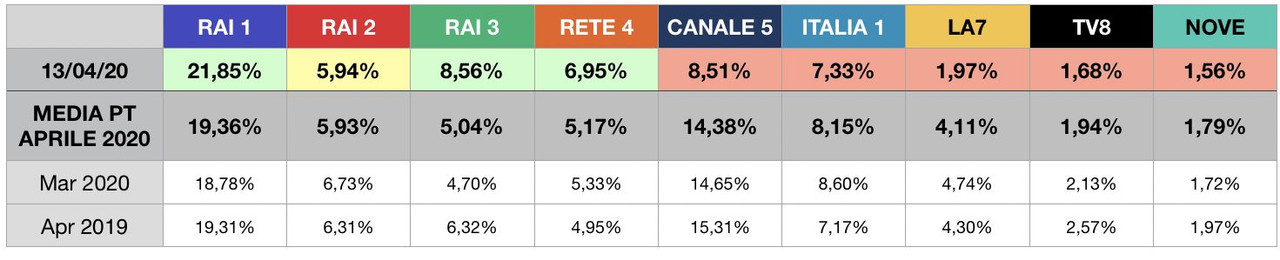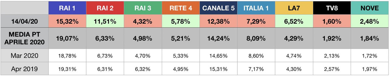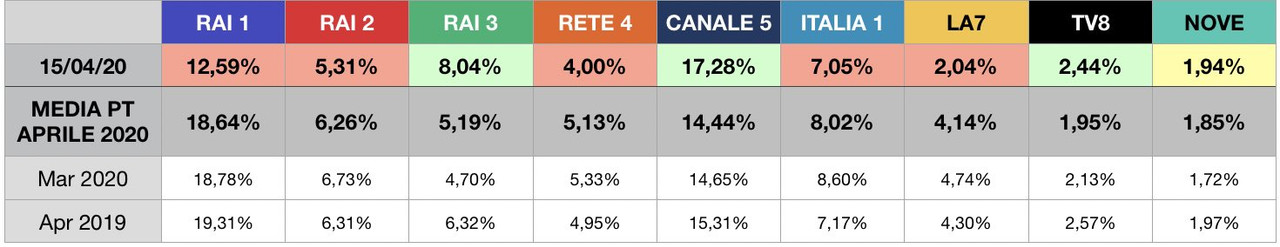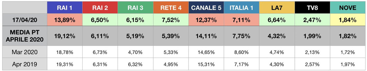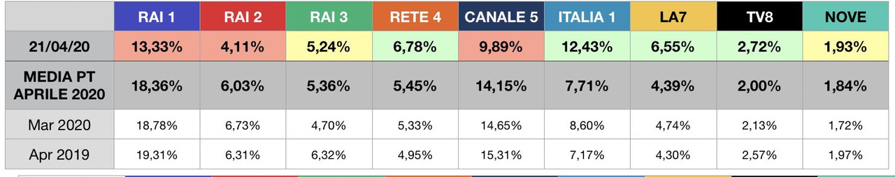 RAI1 Messa – 1144 22.33 UnoMattina – 1408 17.57 Tg1 ore 8 – 1716 23.35 Storie Italiane – 1468 15.32 + 1532 12.87 Linea Verde – 1966 10.29 CANALE5 Mattino 5 – 1293 14.58 + 1232 13.06 Forum – 1968 14.33