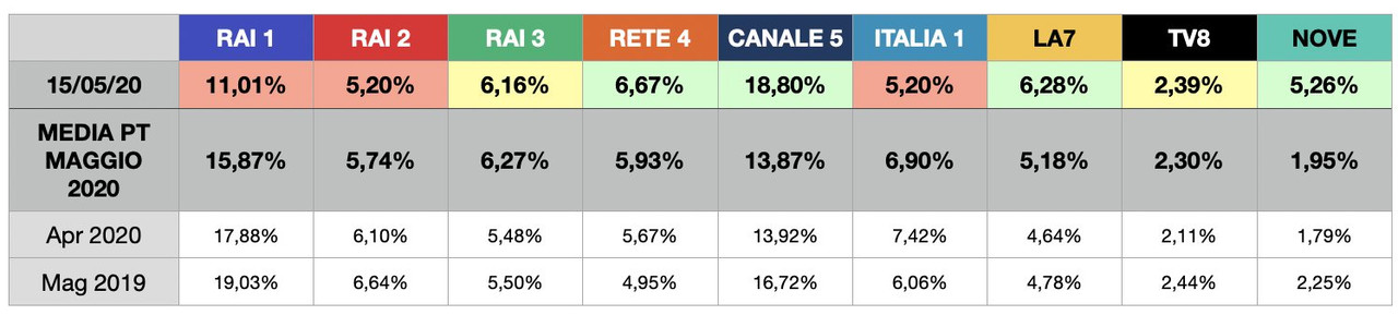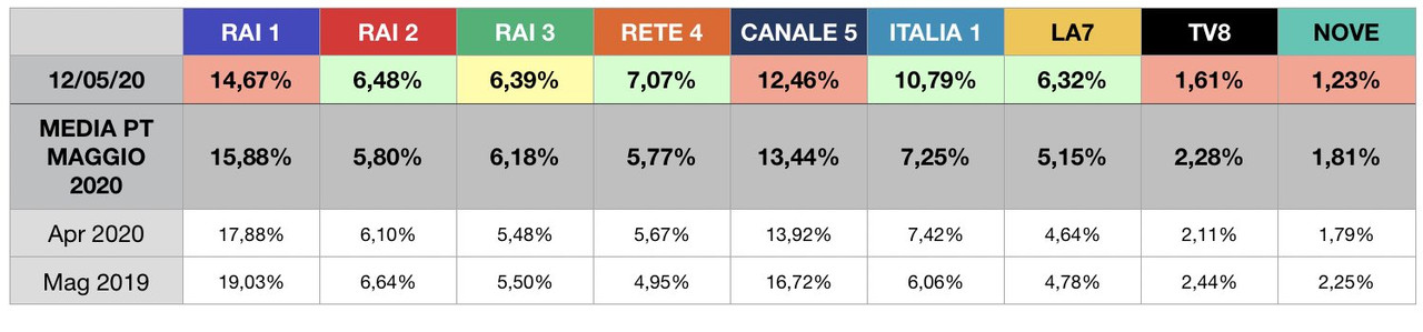 RAI1 UnoMattina – 1177 16.47 Storie Italiane – 1143 14.87 + 1124 11.78 CANALE5 Mattino 5 – 1220 15.77 Mattino 5 – 1215 15.69 + 1131 14.59 Forum – 1785 15.51