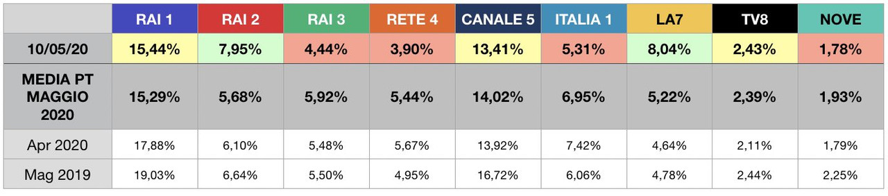 RAI1 Vieni da Me – 1766 10.52 Paradiso Signore – 1444 10.55 La Vita in Diretta – 1362 10.53 + 1887 13.59 CANALE5 Beautiful – 3002 15.40 Una Vita – 2691 15.16 Uomini e Donne – 2736 17.65 + 2533 17.90 Il Segreto – 2162 16.61 Pomeriggio 5 – 1866 14.26 + 2005 13.69