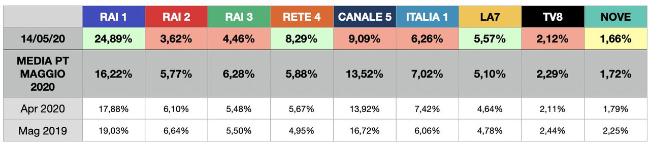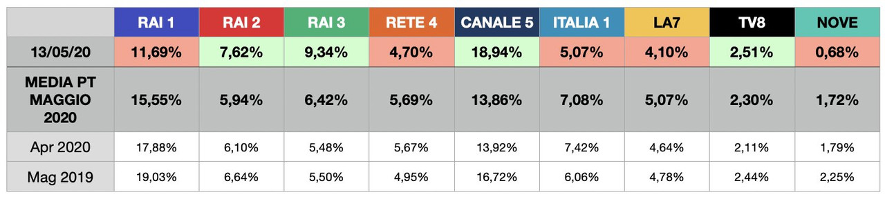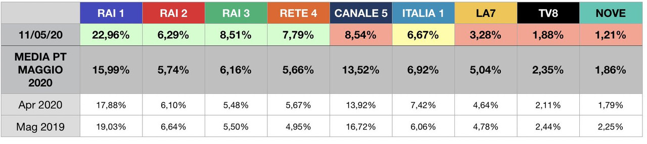 RAI1 Storie Italiane – 917 12.35 Storie Italiane – 1130 11.69 Linea Verde – 1769 10.42 CANALE5 Mattino 5 - 1158 15.26 + 1035 14.12 + 1087 14.32 Forum – 1827 15.50