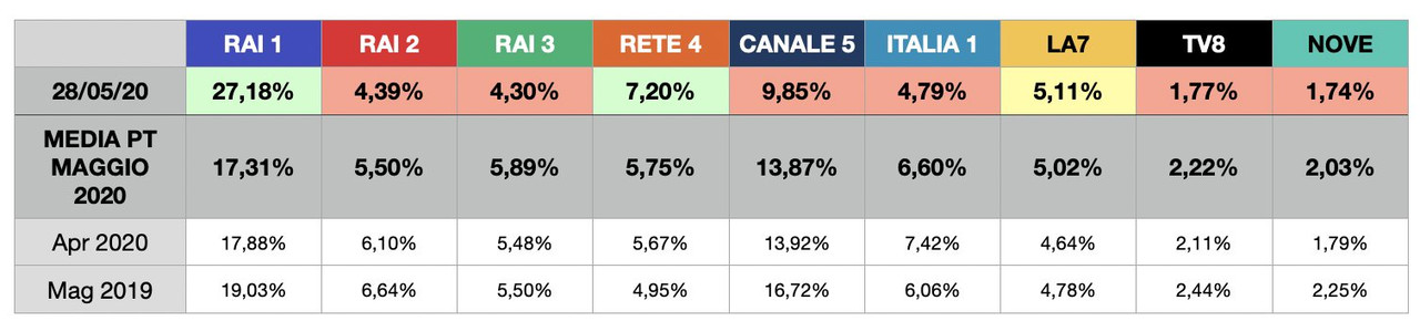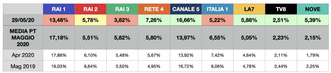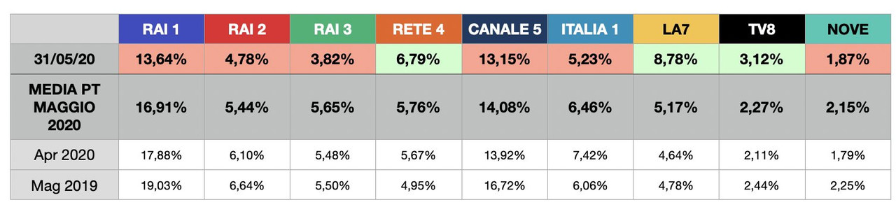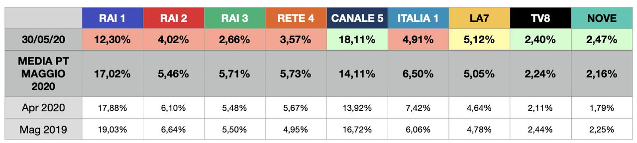 RAI 1 si conferma la rete più vista in Prime Time, in calo di quasi un punto rispetto ad Aprile. Canale 5 recupera qualcosina (grazie alle repliche di TSQV e - in parte - ad Amici Speciali). Male Rai 2, che diventa sesta rete ed è assediata addirittura da La7. Rispetto ad Aprile buona crescita delle tre reti più piccole. Rispetto al 2019 bene La7, Italia 1 e Rete 4.