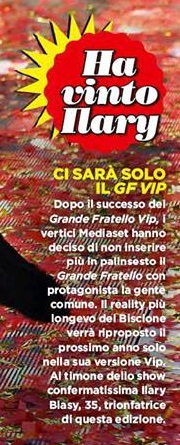 Sembrava solo un arrivederci con appuntamento il prossimo anno, ma pare proprio che il Grande Fratello in versione Nip (non famosi) non andrà più in onda. Ad essere reclusi saranno solo i Vip, per la gioia della conduttrice Ilary Blasi: “Dopo il successo del Grande Fratello Vip – fa sapere Alberto Dandolo per “Oggi” - i vertici Mediaset hanno deciso di non inserire più in palinsesto il Grande Fratello con protagonista la gente comune. Il reality più longevo del Biscione verrà riproposto il prossimo anno solo nella sua versione Vip. Al timone dello show confermatissima Ilary Blasy, trionfatrice di questa edizione.