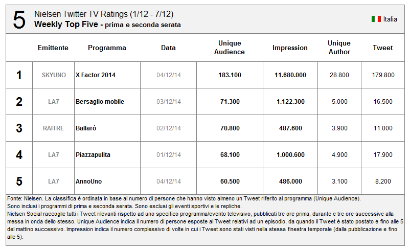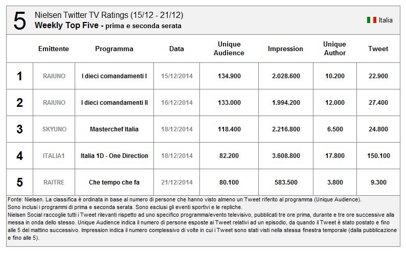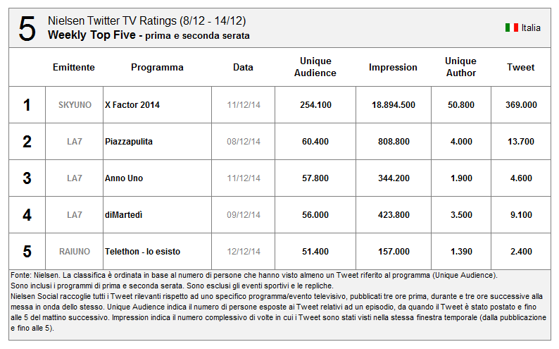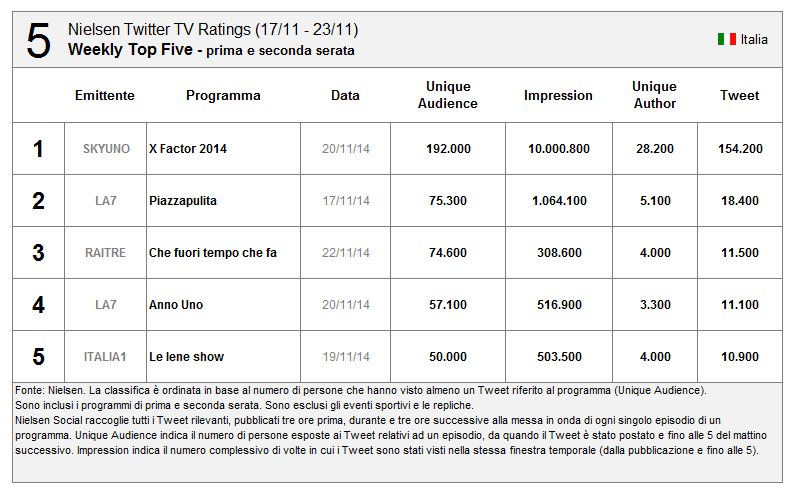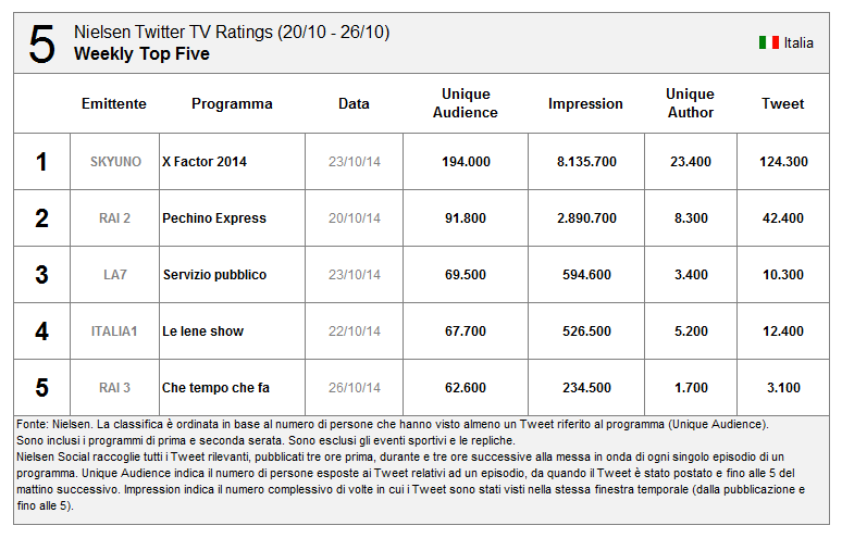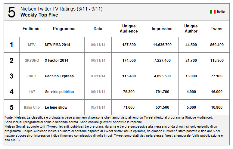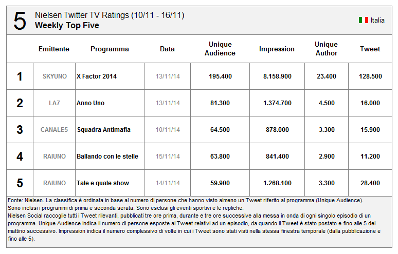 #Nielsen #TwitterTV Ratings disponibile in Italia. Ecco i 10 programmi più social della scorsa settimana #socialtv. pic.twitter.com/FmzkzEmO5x