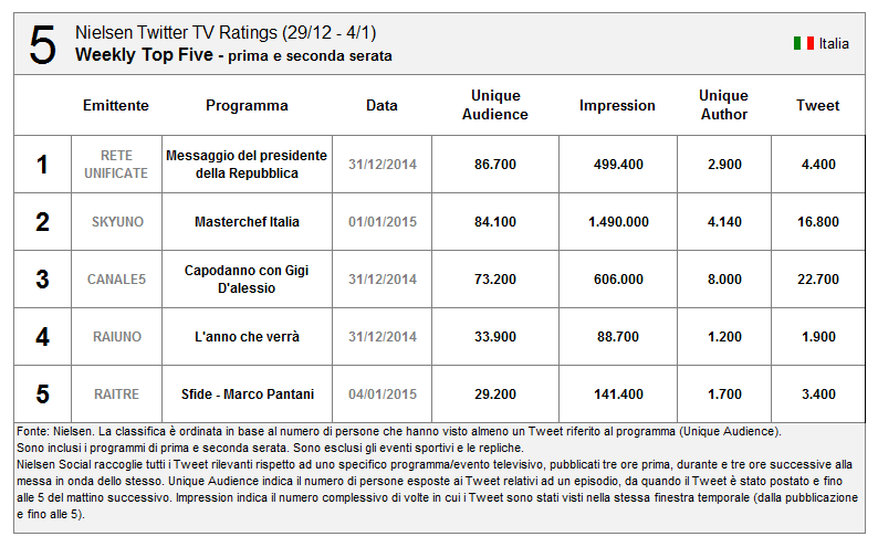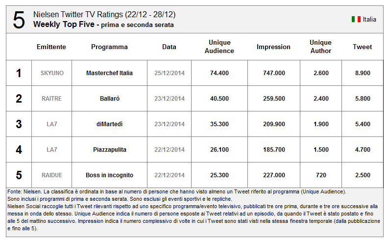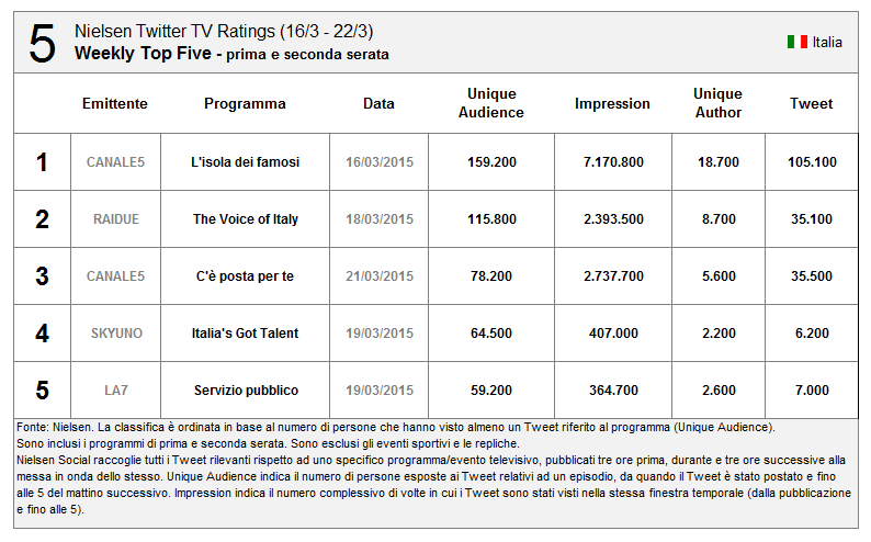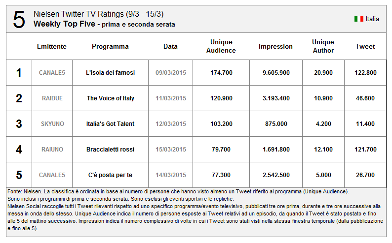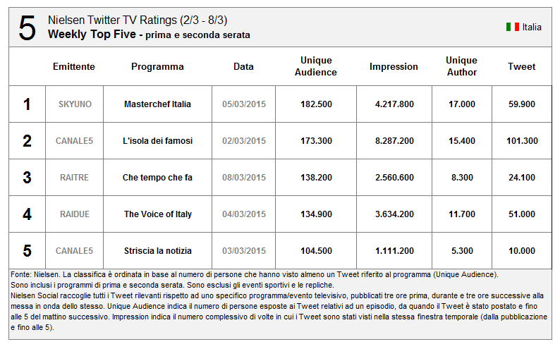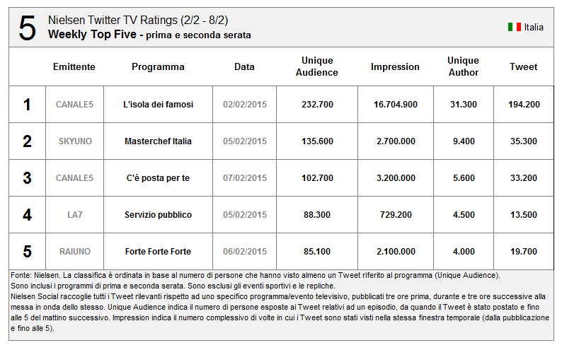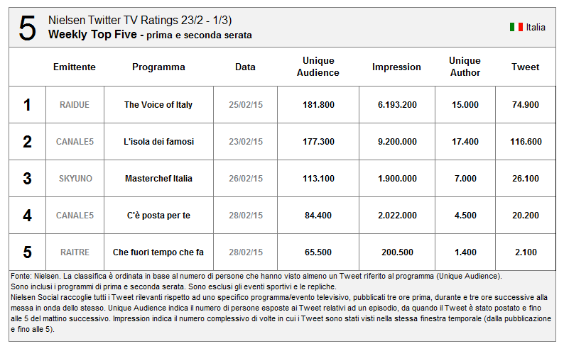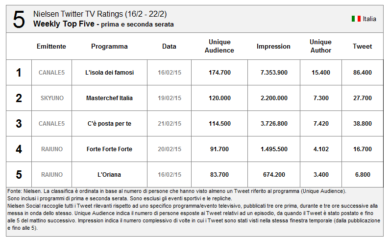 Per quanto riguarda Sanremo un buon risultato (ma inferiore alle aspettative secondo molti esperti di Social TV, con la prima, seconda e terza serata superiori alla finale)