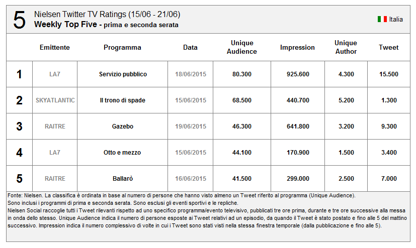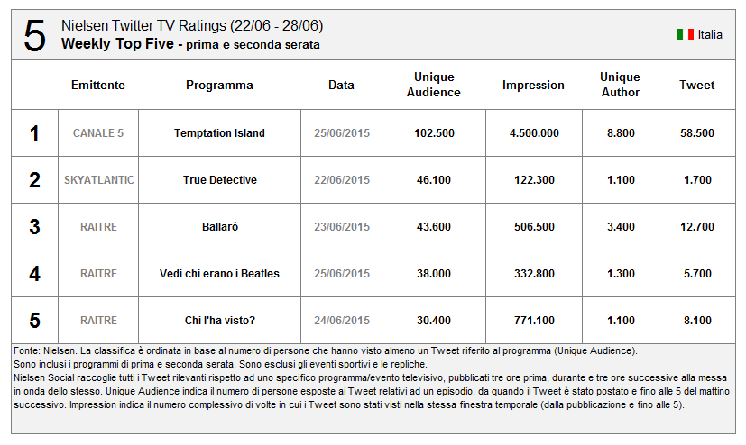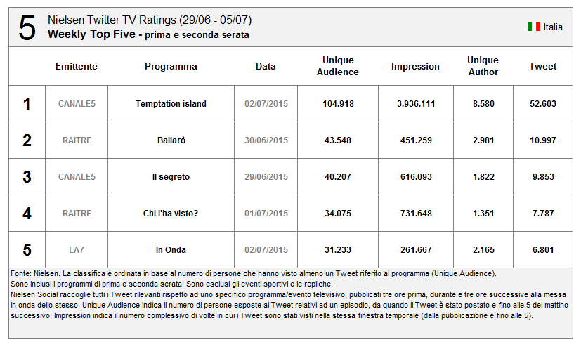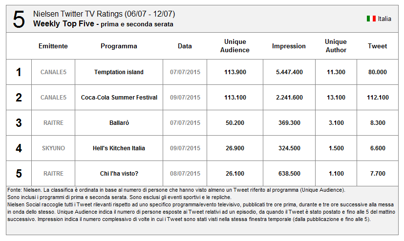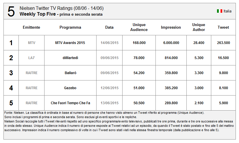 Nuovo record assoluto di Tweet (il precedente erano i 583k di Sanremo 1^ serata), ma non di UA (la finale di X Factor e Sanremo fecero di più).