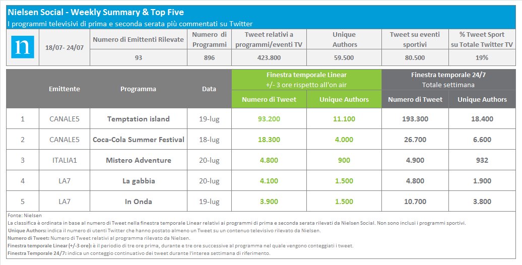 OfflineI programmi TV più commentati della settimana su #Facebook e #Twitter nella #NielsenSocialTop5 #SocialContentRating. pic.twitter.com/CnlsFeR9aY