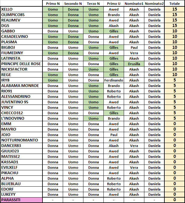 Passando alle scommesse su topic, nessuno di voi è riuscito a centrare la combo "Uomo-Donna-Uomo-Gilles" ed aggiudicarsi il bonus di 30 punti relativo all'ordine di lancio dall'elicottero. Disastrose anche le scommesse relative alla prima nomination, con @Il principe delle rose rosse unico a guadagnare 5 puntando sulla debacle di Drusilla.