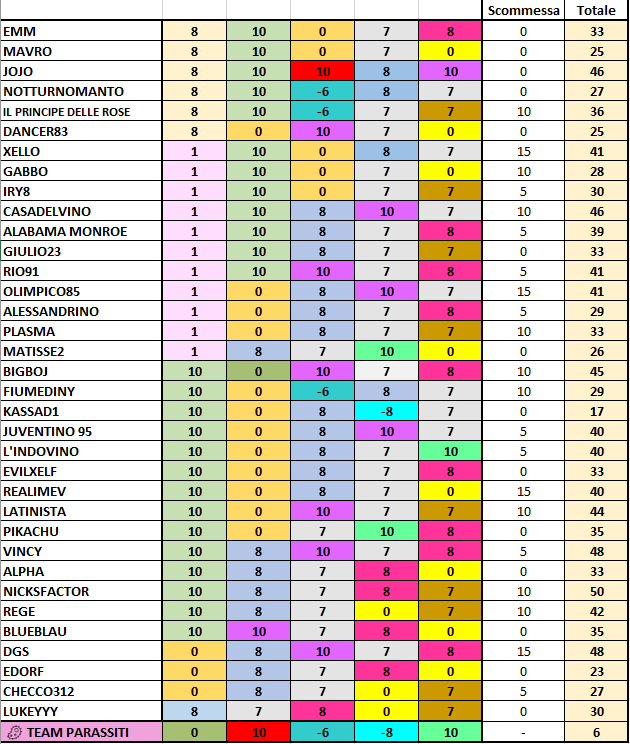 E ora passiamo finalmente a scoprire il punteggio complessivo totalizzato da ciascuno di voi: