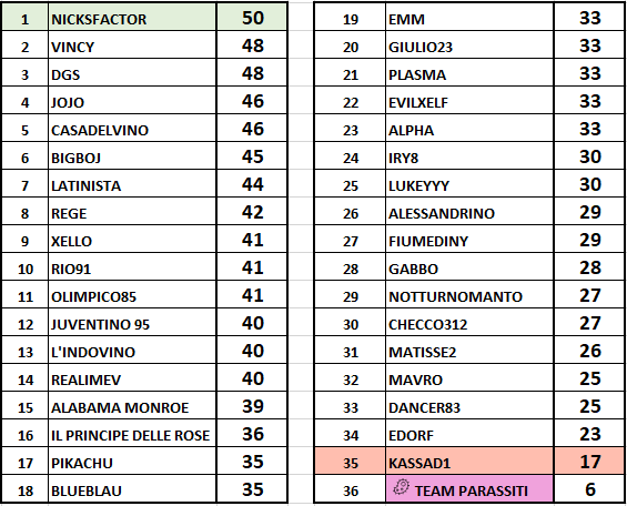 33 punti sotto, margine assolutamente recuperabile, troviamo invece @KassaD1 in ultima posizione. La scelta di Ferdinando nel team non ti ha ripagato... ma il bonus guadagnato potrebbe tornarti molto utile per la prossima puntata!