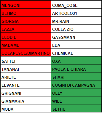 Per il Day2, come ieri, siete chiamati a pronosticare sulla classifica della prima giuria chiamata al voto, quella della Sala stampa, Radio, Tv e Web. Qui sul topic dovete indicare quella che per voi saranno le prime 4 posizioni e le ultime 4.