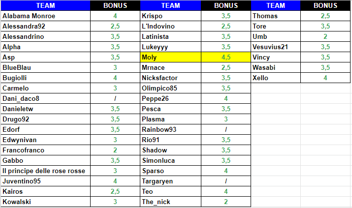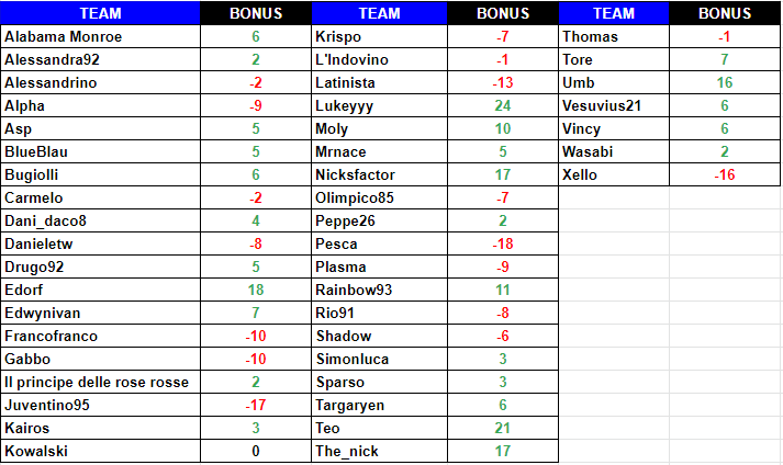 Intanto che continuano ad arrivare le scommesse per questa terza serata ero in debito della classifica dei bonus. Attenzione questa era la situazione Prefestival e non sono ancora conteggiati i bonus delle prime due serate che cercherò di recuperare a breve.